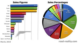 The numbers are in, and they’re full of surprises. Toyota’s recall fiasco hasn’t hurt sales – in fact, they’re up quite a bit over February. Many automakers’ numbers were up in March, due to heavy incentives and 0% financing. Ford fell to third place in March, lead by GM and Toyota. The interesting thing is that the top 3 automakers in March were almost double the number 4 player, Honda. Nissan, Chrysler and Hyundai followed, and then another significant drop before Volkswagen, which was less than half of Hyundai’s sales.