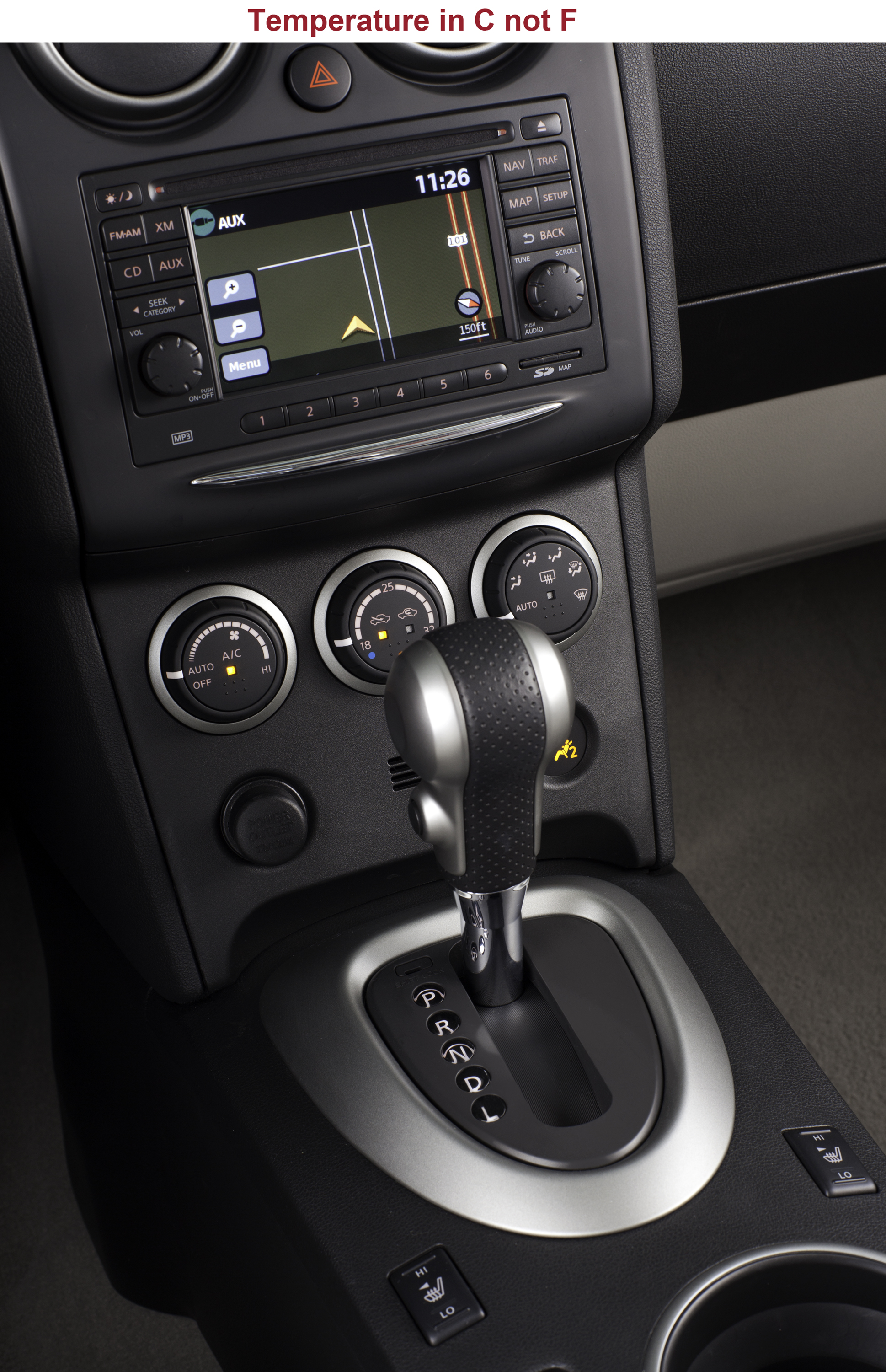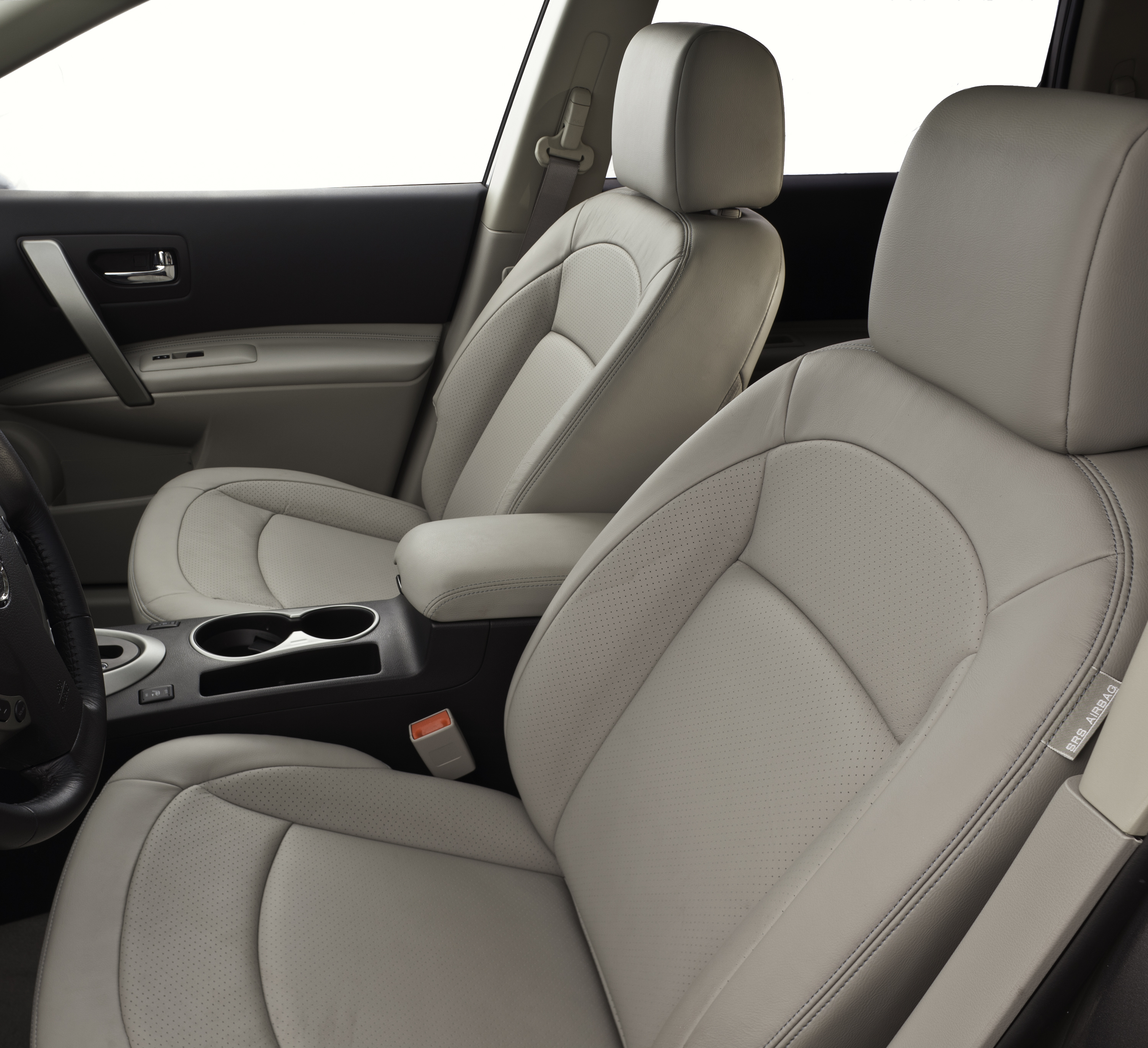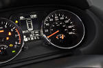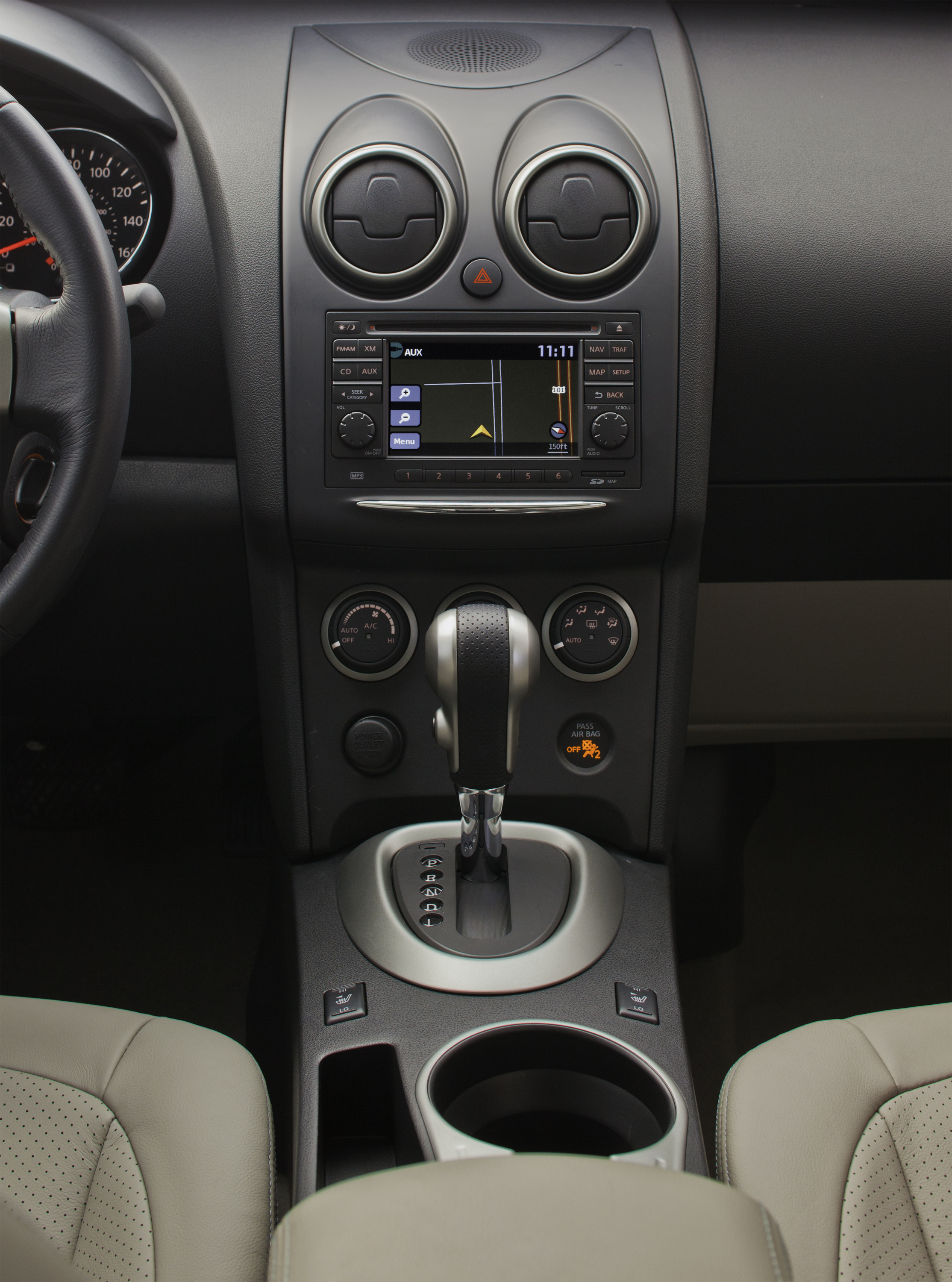 Inside the Rogue, you’ll find a two-tone black over beige theme, with the standard Nissan color scheme of red and white for its gauges and needles. An overly large hood covers the main instrument panel, and the center console looks out of place with its squared-off lines, in stark contrast to the rounded shapes found elsewhere in the Rogue. The information display found between the two main gauges in the instrument panel, however, looks decidedly upmarket, reminding me of the ones used by Mercedes-Benz. The 5″ touch screen for the navigation seems a bit small, especially considering the 7-8″ screens found in other cars, and its distance from the driver.