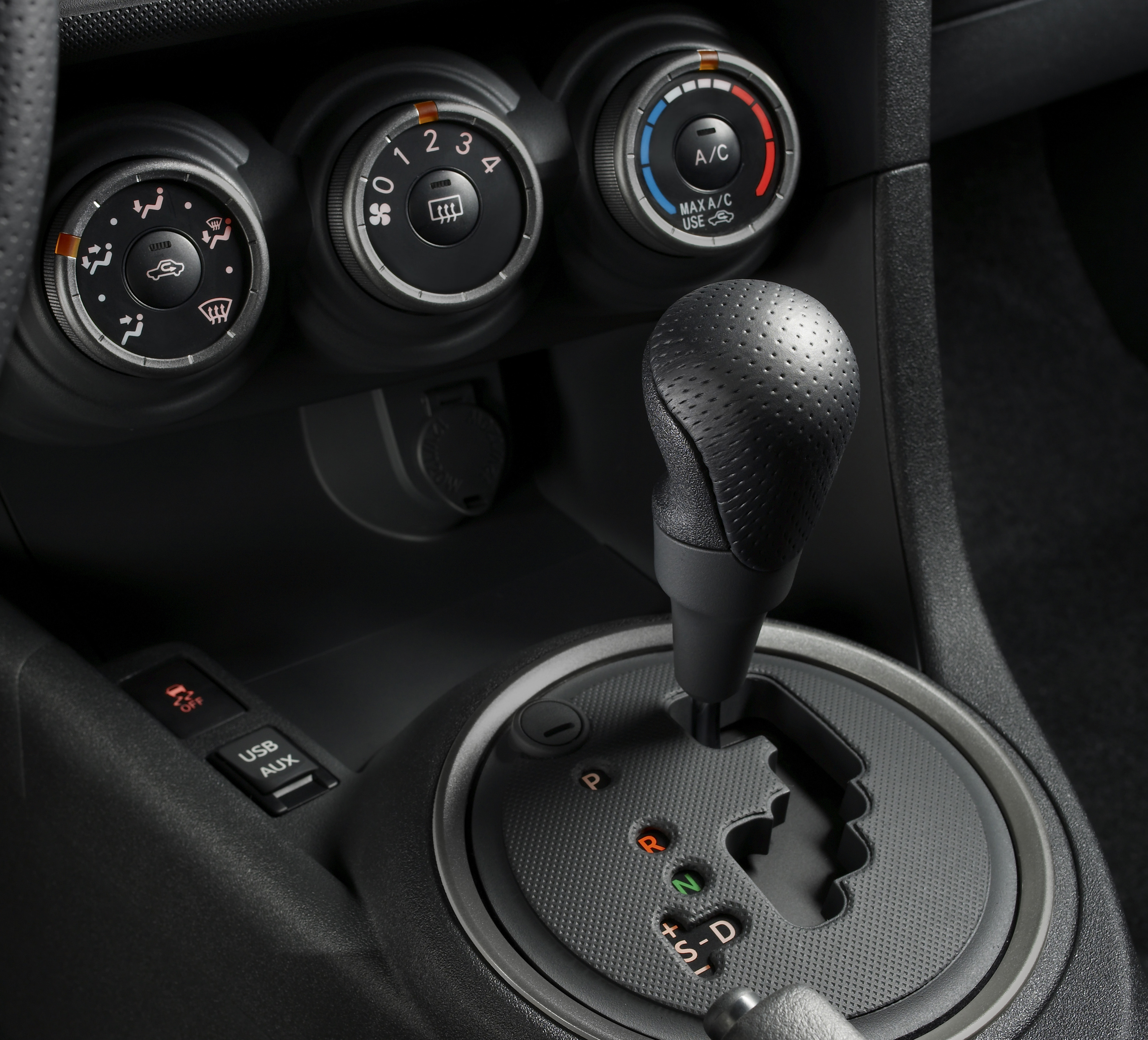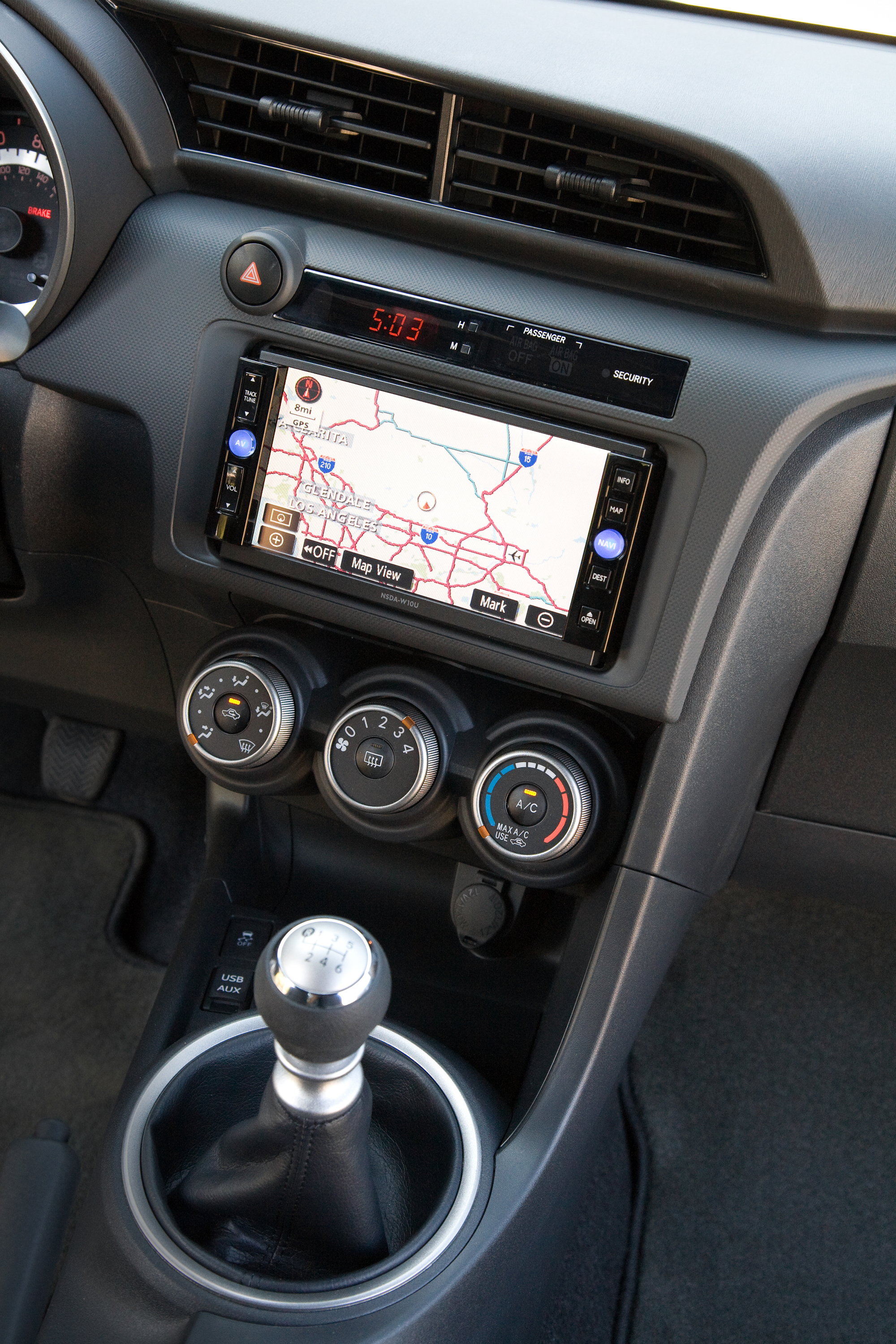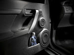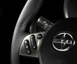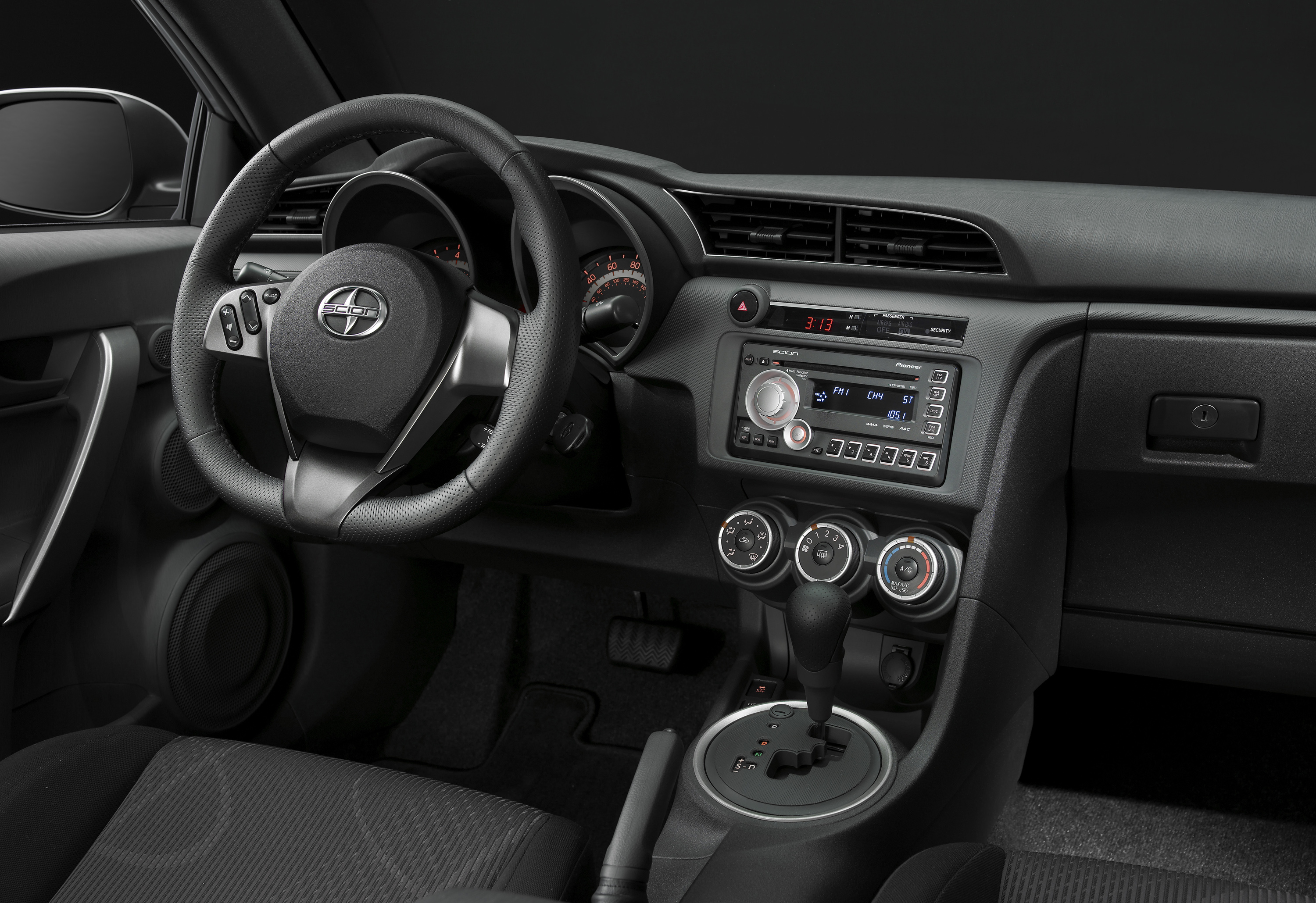 Inside the new tC it’s a much better situation. There appear to be better materials, at least with better textures to them, and while the radio still looks like an aftermarket install, you at least get the option of satellite navigation and HD radio this time around. The thick steering wheel with auxiliary radio controls looks good, and it’s interesting to see an “active 3-way front stage” (in audiophile speak) of speakers all on the doors, including the tweeter, mid-range speaker and woofer from top to bottom. Toyota even mentions that the new tC shares some of its stereo components with the Lexus LX470.