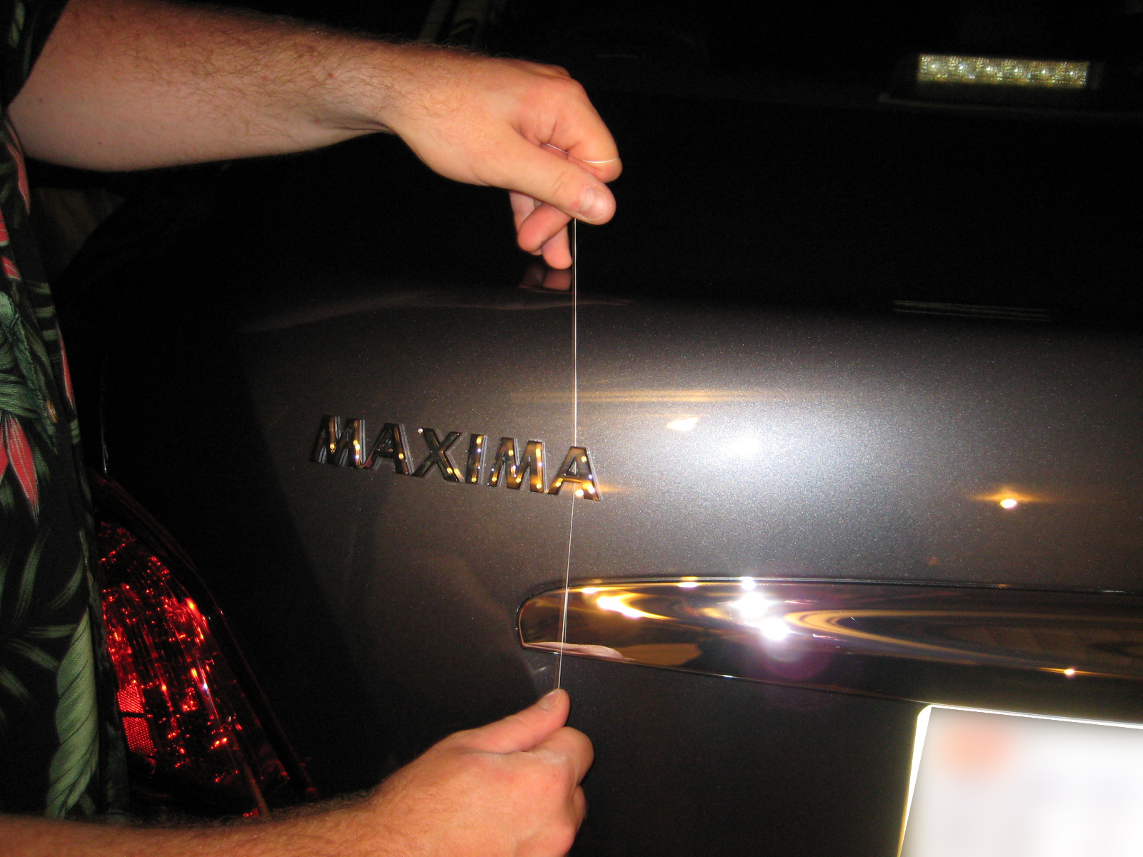 I just bought a 2010 Maxima and removed the lettering as well. I used a very thin flat head screwdriver wrapped in a soft cloth and just popped each letter off…I like the dental floss idea a LOT better though. Great How-To!