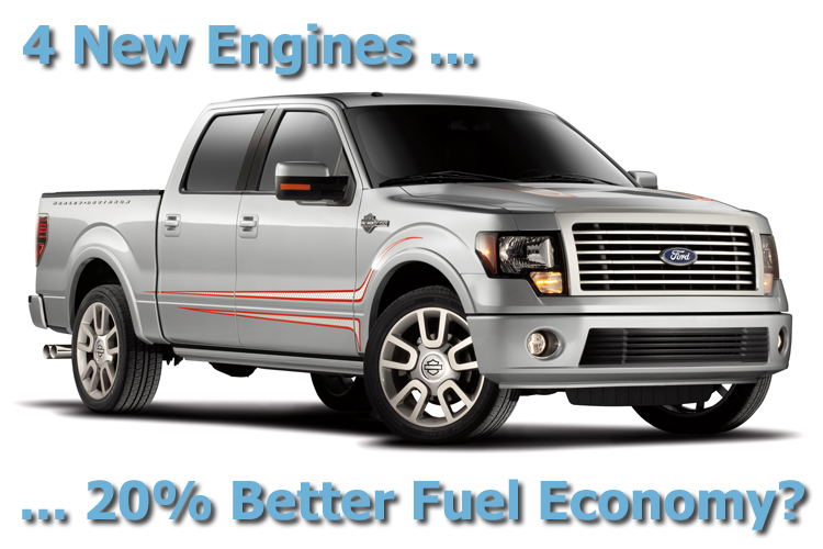 According to a press release published by Ford today, the four engines available on its upcoming 2011 F-150 pickup should yield 20% gains in fuel economy compared to the same models in 2010. Since no V6 is available on the 2010 F-150, this is a believable number, especially considering the advanced engine technologies used to craft the new 5.0 and 6.2-liter V8s. As a recap, the engines available in the 2011 F-150 will be the 3.7-liter V6, 5.0 and 6.2-liter V8s, and later on in the model year, a 3.5-liter EcoBoost V6. If the 20% number comes true, look for fuel economy numbers to be 14-17 city, 18-24 highway.