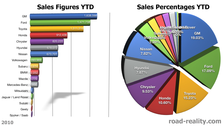 Well, the 3rd quarter of 2010 is over, and sales are down, yet again, for the U.S. automotive industry. While all the other news outlets are saying sales were up 29% in September year-to-year, sales were down when viewed month-to-month. While there is 1 less day in September than there is in August, this doesn’t account for a 3.32% drop (almost 33,000 vehicles) from month to month. Read on for my analysis and graphs.