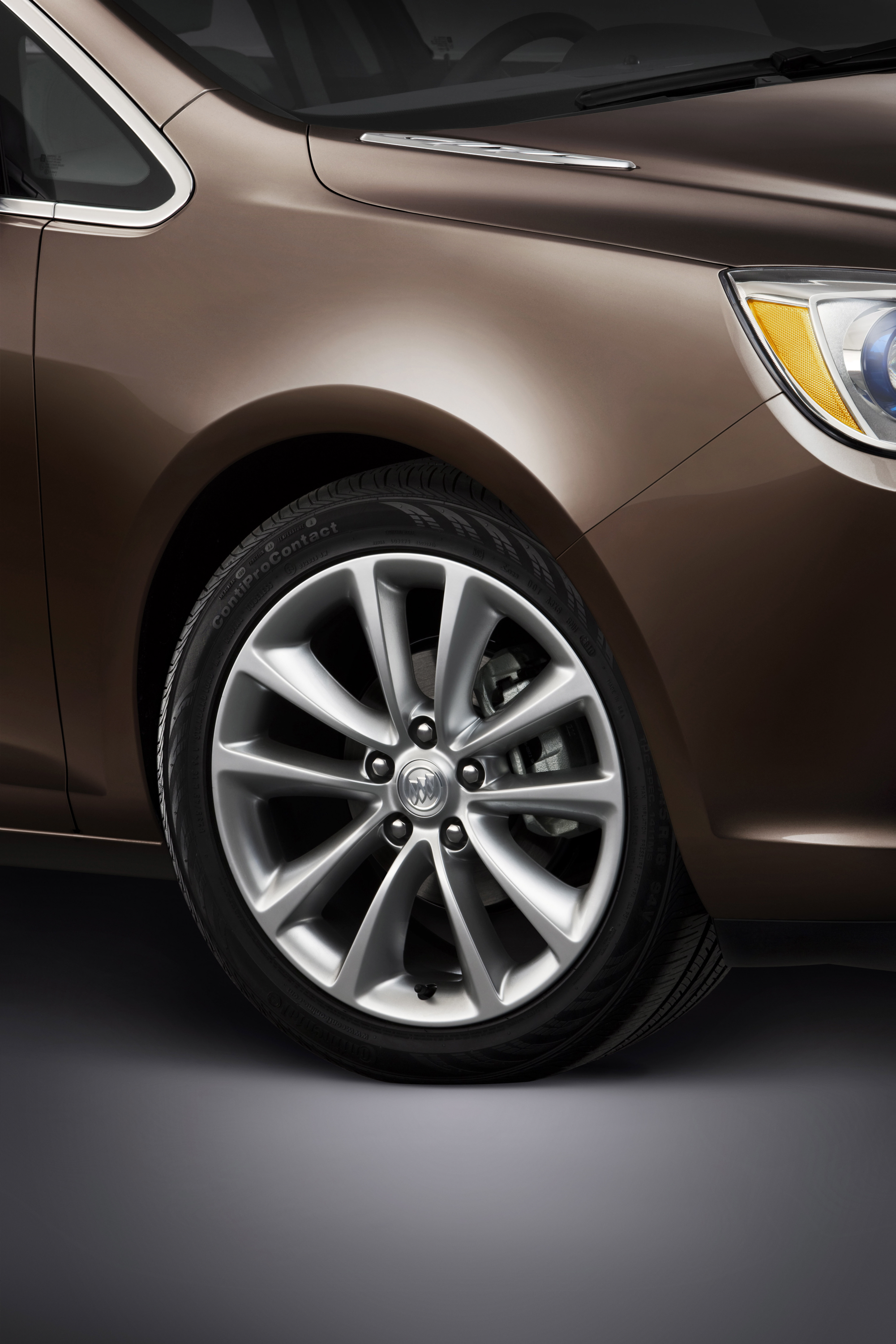 Verano carries the modern Buick design cues introduced on the Enclave and interpreted for the LaCrosse and Regal. They include a bold, detailed black chrome waterfall grille, prominent blue translucent projector beam headlamps, portholes, chrome accents, premium wheels and a tailored body-to-wheel relationship. An arching roofline connects a steeply raked windshield and fast-sloping rear pillars to give the car a sporty profile that’s complemented by large, 17-inch standard multi-spoke forged alloy sterling silver-finish wheels. Two premium 18-inch wheel designs are available.