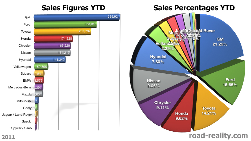 February was a great month for new-car sales, with the total volume up 21.28% over January, and almost 27% over February of 2010. Those are the overall numbers, but the general trend for February was that American car companies had a good time, while most of their overseas competitors struggled. Click past the jump for my analysis and graphs.
