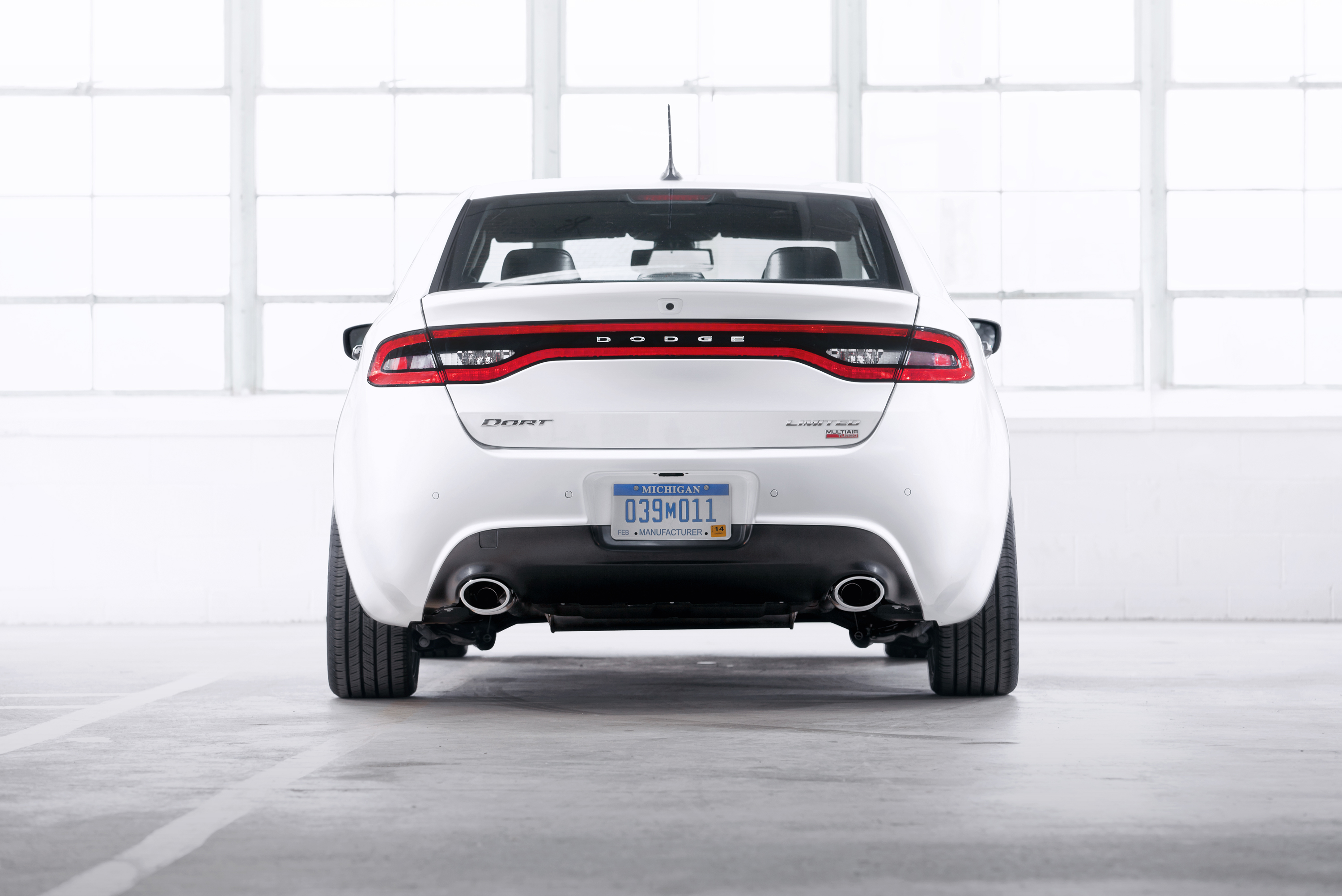 The rear view of the all-new 2013 Dodge Dart features an available Charger-inspired “racetrack” full-width taillamp with 152 indirect glow LEDs, and class-exclusive dual exhausts mounted in the rear fascia.