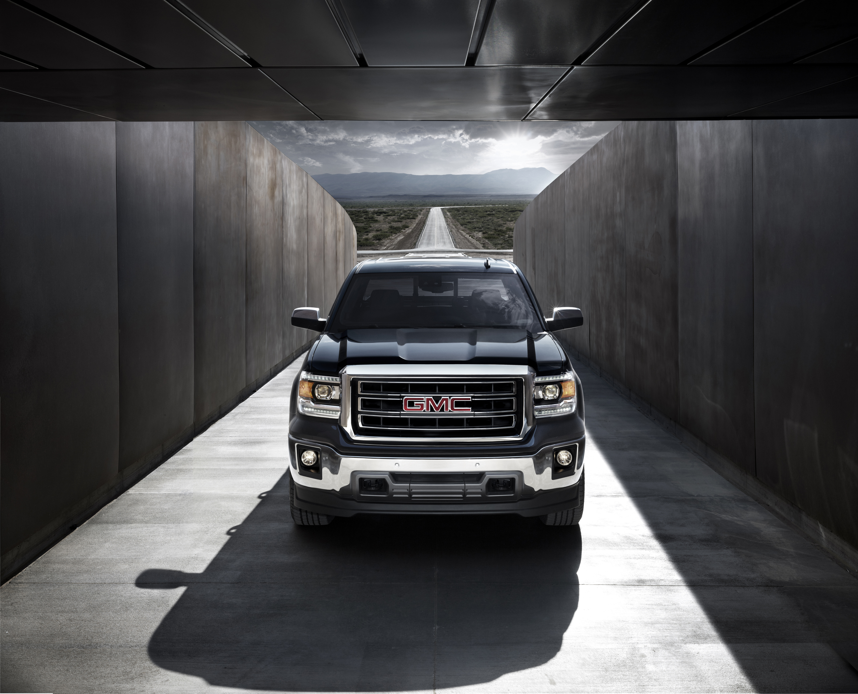 2014 GMC Sierra SLT Crew Cab in Iridium Metallic head on shot- o 2014 GMC Sierra SLT Crew Cab shot head on shows the chrome bumper and grill that give the new Sierra a bold and imposing stance.