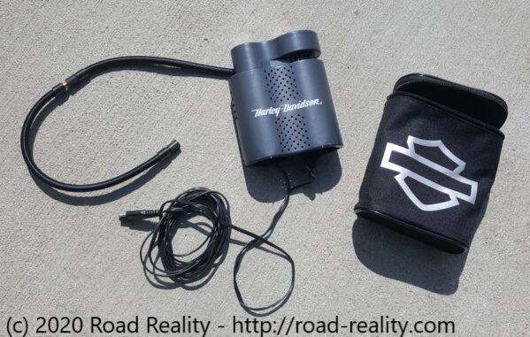 The unit itself doesn’t feel overly robust, but it’s not heavy, so it’s easy to put in a backpack, saddle bag, or tail bag. It’s not overly big, either, about the size of two well-made sandwiches. Its got Harley’s name in script on one side, the light and pressure gauge on the top, and a nice opening on the bottom to store the power cord, as well as built-in tabs to hold the valve stem connector in place when not in use.