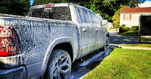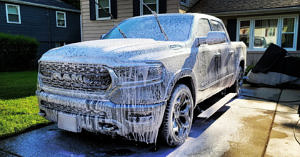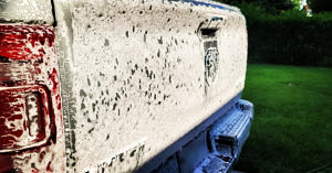 With a now-wet vehicle, use the pressure washer to apply the Sticky Snowball Foaming Wash to the vehicle. I like to set the foam cannon to MAX SOAP and a decently-wide spray, but let your gut guide you on this one. Let it sit for 2-3 minutes, reapplying if needed. This is the really fun part – all the prep and rinsing leads to a suds-covered vehicle. Ok, maybe I’m alone in this… but I do find it satisfying to see. Make sure to get inside the fender wells and under the bumpers. This foaming wash really stuck to my truck – I can’t wait to try it on my motorcycles! This breaks up the dirt on the vehicle and adds lubricity to the paint, allowing the wash mitt to slide easier in the next step, which prevents swirl marks.